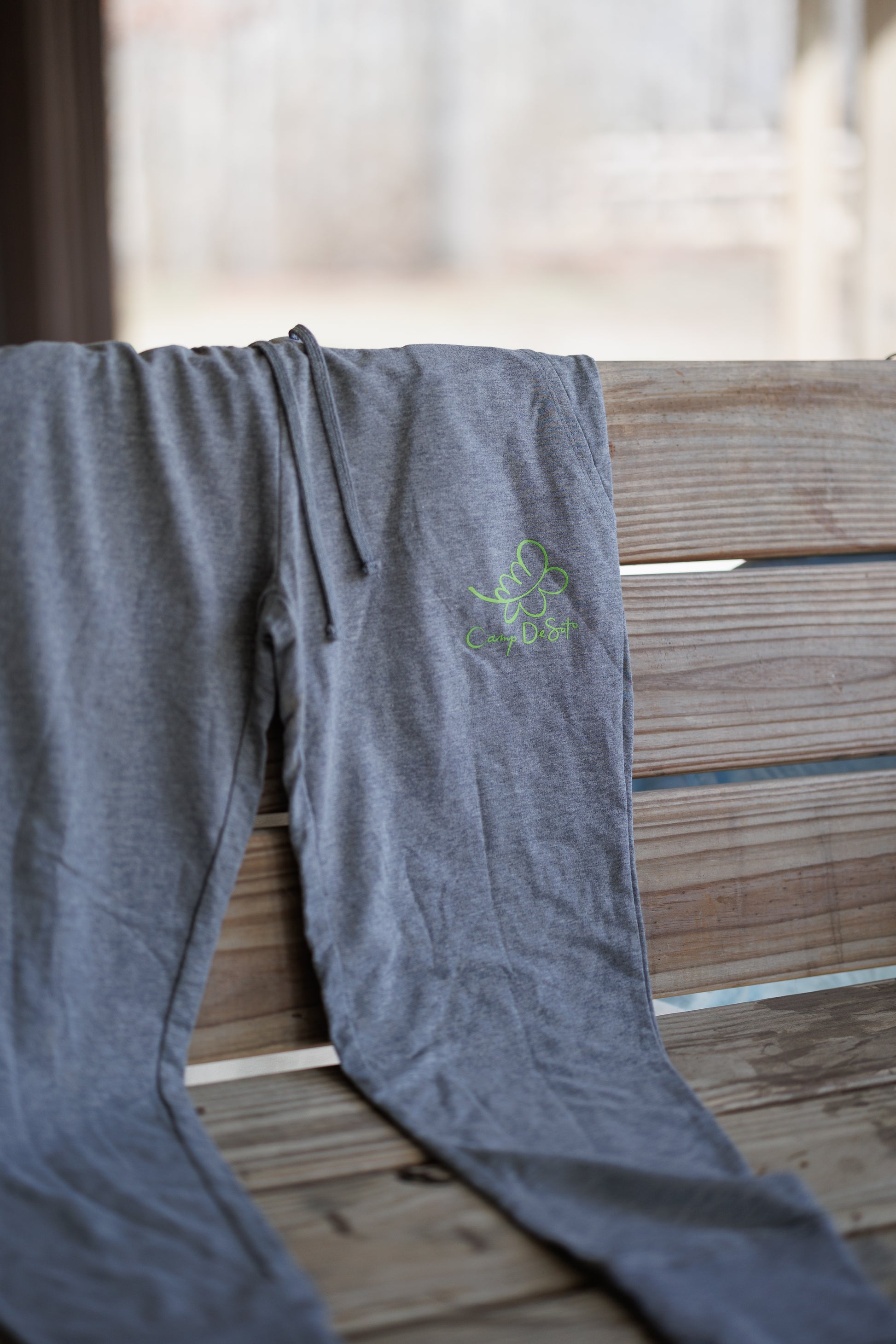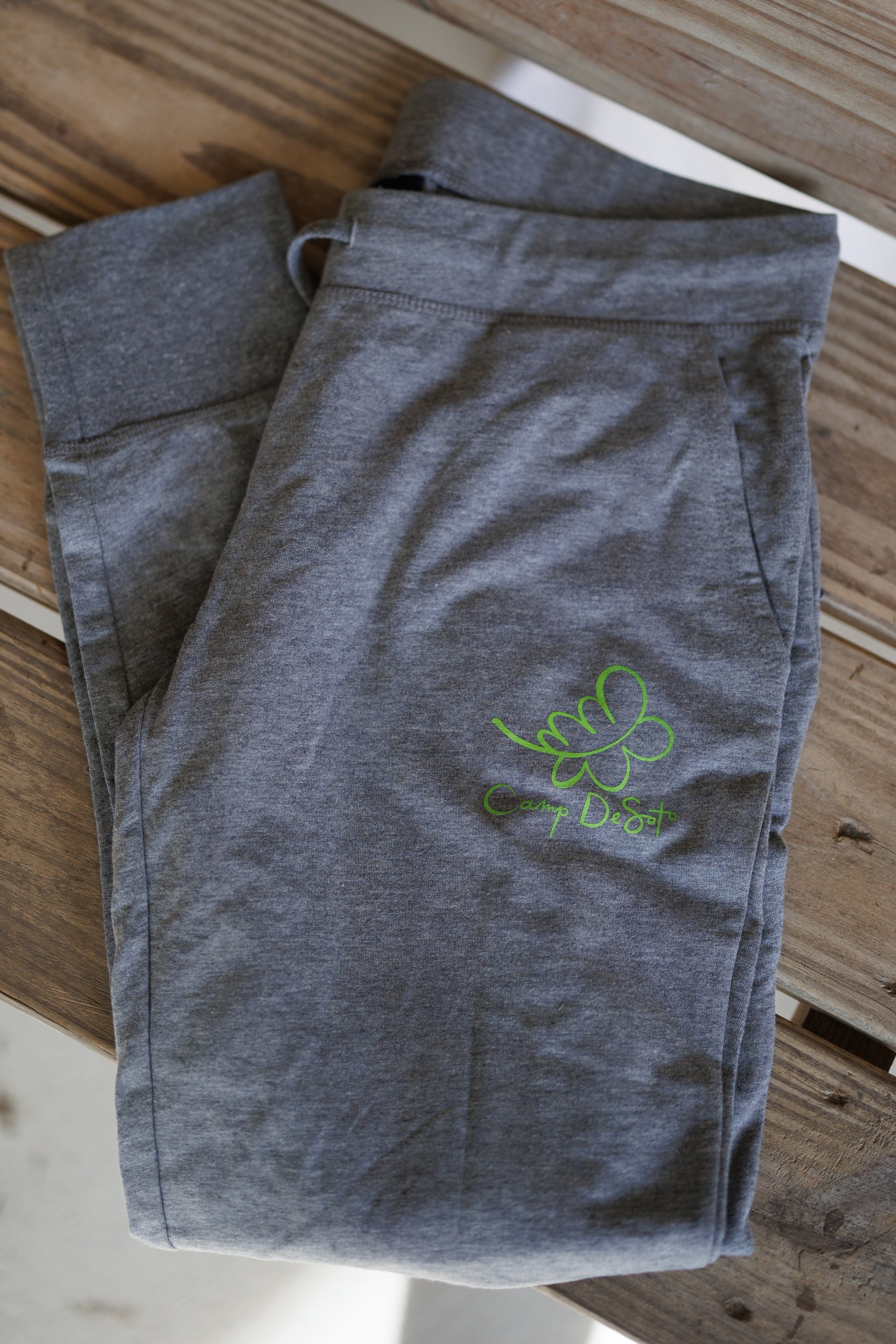 Charles River joggers in Pewter Heather.  Lime green leaf logo printed on the left pocket. Drawstring waist, tapered at the ankles.