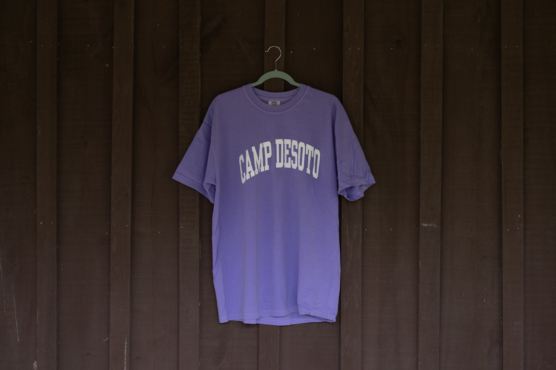 Our classic CAMP DESOTO block letter tee on a Violet Comfort Colors tee. The lettering is featured in white.