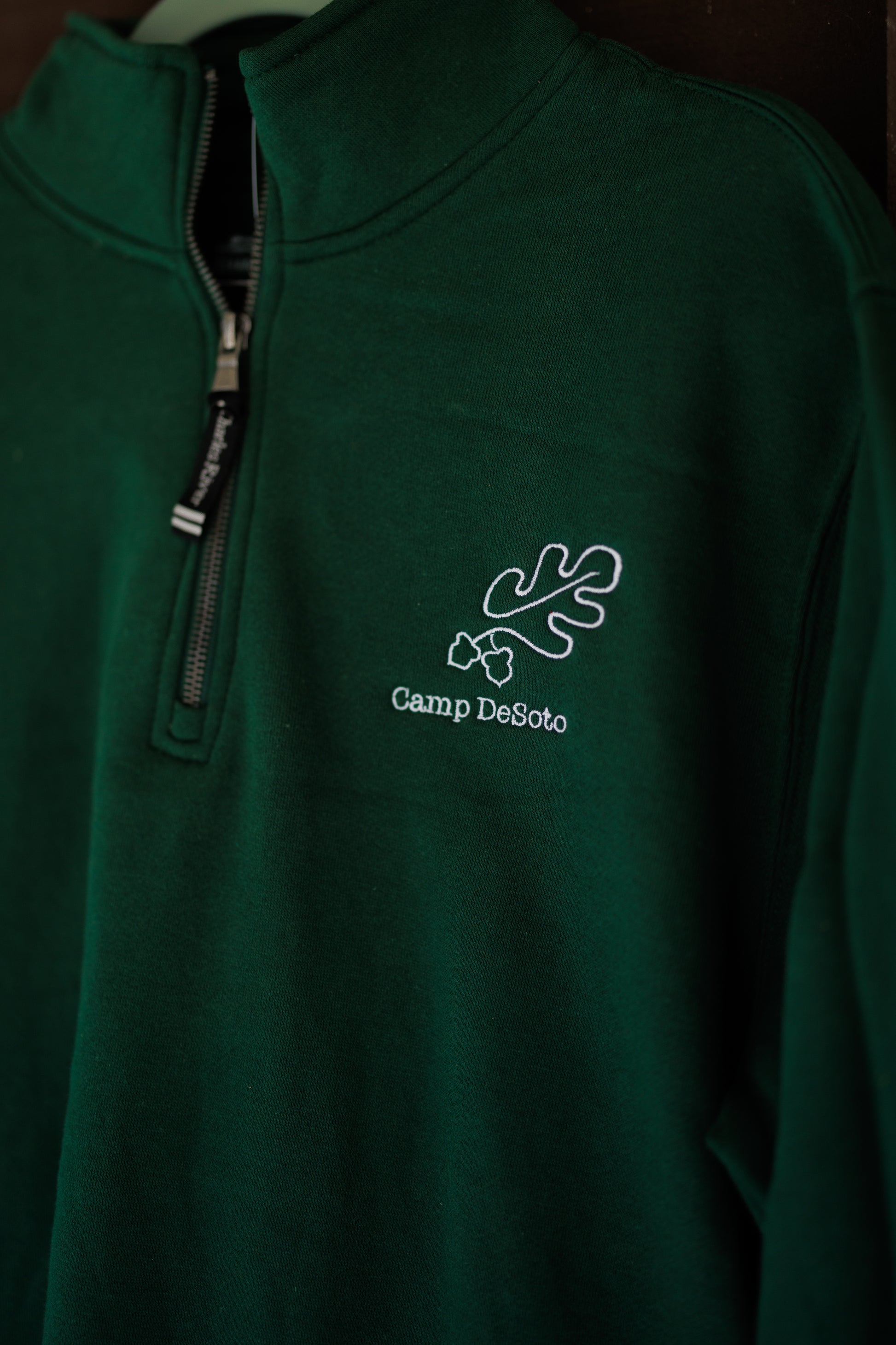 Forest green Charles River quarter-zip fleece pullover, embroidered with the Camp DeSoto leaf.