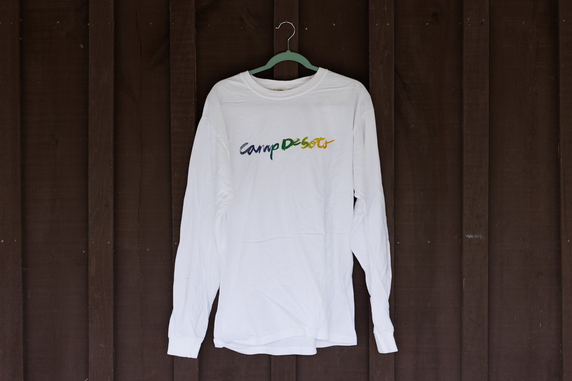 Designed by Susan Woodard, the colors in this t-shirt were inspired by the words of the breakfast blessing: "God has created a new day, silver and green and gold." The blue, green, and yellow watercolor letters are painted across a soft, white long-sleeve Comfort Colors t-shirt.
