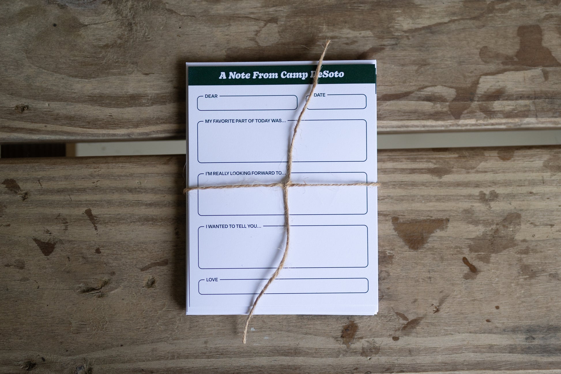 Set of Camp DeSoto flat cards with prompts for your camper to fill in! Choose between a Junior Term or Full Term set, one for each day! Matching envelopes with pre-printed return address are included.