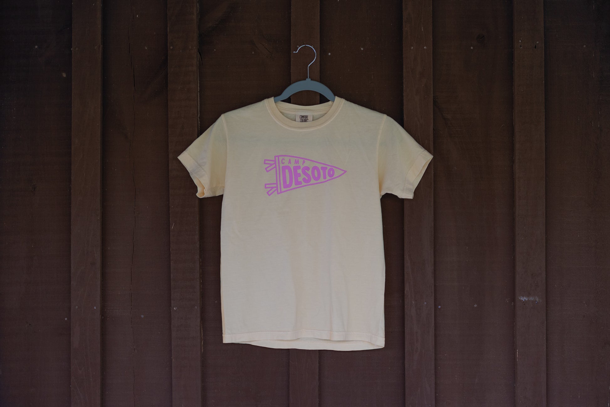 This Youth tee is a Comfort Colors tee in the color "Butter." It features a new Pennant design in pink, perfect for the Summer!
